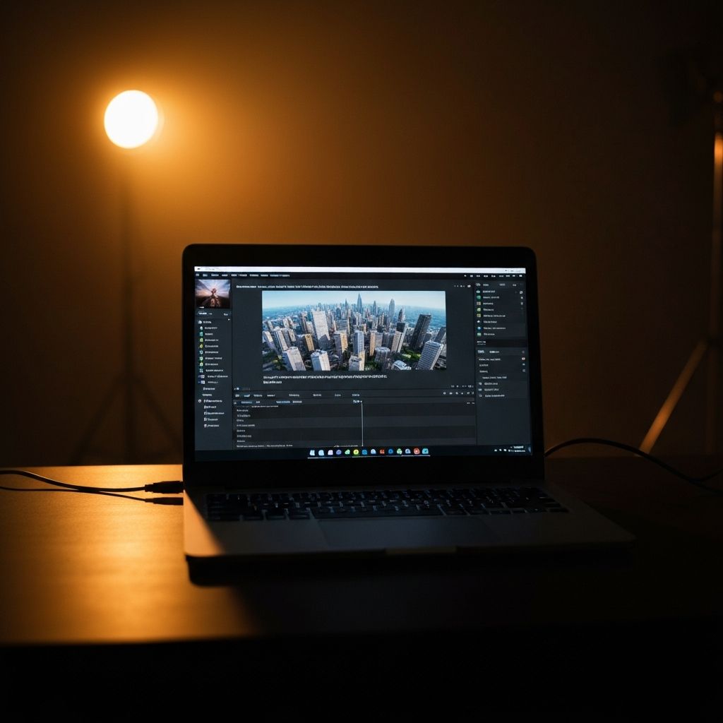 Quick montage: a text prompt typing on screen dissolves into a fully rendered cinematic city flyover. Smooth camera push into a glowing laptop screen showing the AI Studio interface.